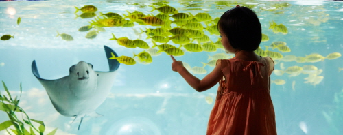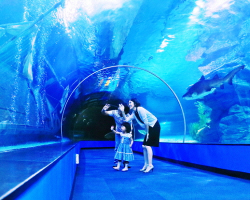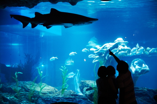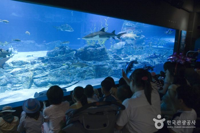 L’ Aquarium de Busan contient plus de 35000 espèces différentes de poissons, algues, reptiles et amphibiens. Ce lieu exceptionnel est un des aquariums les plus réputés de la Corée. Il comprend un espace gigantesque de 36,000 m2 , avec 3 niveaux souterrains et un parc extérieur. Au niveau – 1, il y a un simulateur, un magasin de souvenirs, divers endroits pour se restaurer. Au niveaux –2 et –3, se trouvent les aquariums. C’est au niveau –3 que l’on peut découvrir l’incroyable tunnel de 80 m : comme si on marchait dans l’ocean avec toute sorte de poissons, de requins, nageant au-dessus de nos têtes. Voilà une expérience à ne pas manquer .