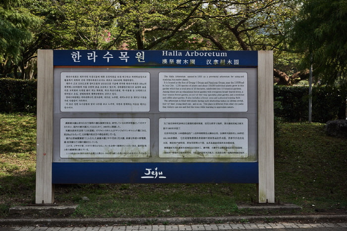 L’Arborétum Halla a été établi pour les études et la préservation de l’ environnement naturel. Ouvert en décembre 1993, Gwangioreum possède 909 sortes d’arbres natals et de plantes subtropicales exposées ici. Dans les jardins, il y a 506 sortes d’arbres et 90 sortes de plantes, et dans la serre, il y a le Hall de Plantes Subtropicales (105 sortes) et le Hall de Plantes Natales (103 sortes) avec un total de 208 sortes de plantes. Il y a 2.722 souches qui sont en périls et rares telles que le Michelia Compressa et le Euchresta Japonica, ainsi que le Chloranthus Glaber qui ne grandit que dans l’étang Cheonjiyeon. A l’Arborétum Halla, vous pouvez rencontrer une forêt de fleurs des quatre saisons, des forêts de toutes les couleurs, et les belles saisons de la mère Nature au Mt. Hallasan.
