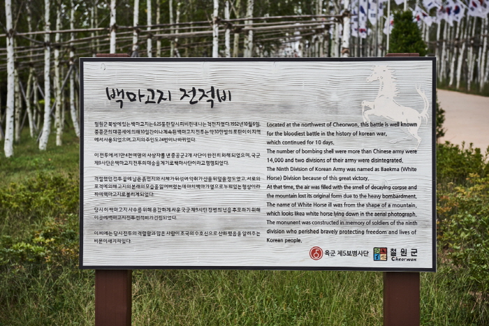 Baengmagoji qui est situé au nord de Cheolwon était un lieu de bataille pendant la guerre de Corée. Ce site est nommé Baengma (백마, Cheval blanc) car la montagne couverte de cadavres et de terre avait une forme de cheval.p>