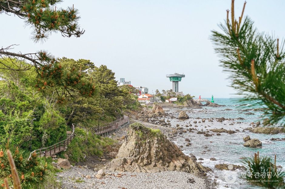Le chemin du son des vagues (Padosorigil) s’étend sur environ 1,7 km, reliant le port d’Eupcheon au port de Haseo. Le sentier côtier est bien aménagé avec des passerelles en bois, des pavillons, des bancs et un pont suspendu, offrant une promenade agréable le long de la mer.
