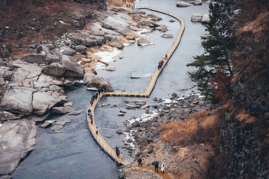 Le parc du fleuve Hantan classé à l’Unesco est réputé notamment pour son pont suspendu aménagé comme si vous marchiez sur la voie lactée. Le pont dispose d’une longueur de 180 mètres tout en étant situé à 50 mètres au dessus de la surface.