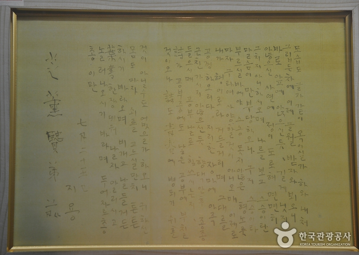 Le hall d’exposition est divisé en plusieurs thèmes comme la frise chronologique de Jiyong, sa vie et sa littérature et une exposition de ses écrits ( poésie, prose).
