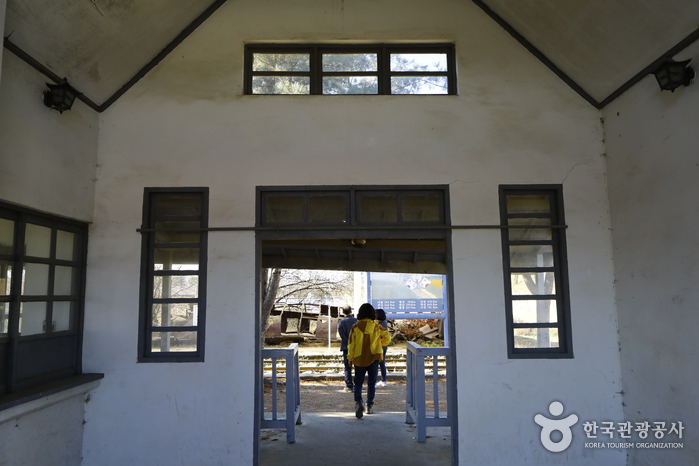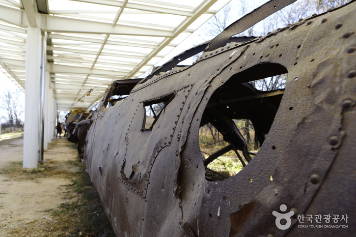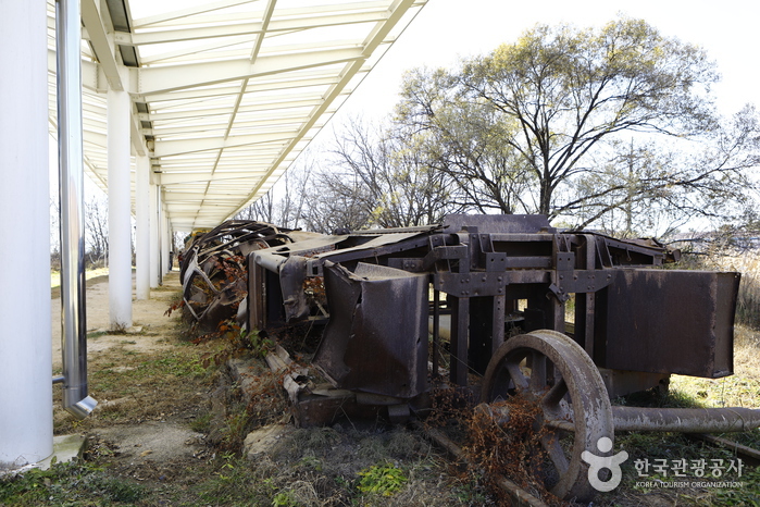 Dans la gare on peut voir une pancarte indiquant « Le train veut rouler », et à côté les reliques d’un train arrêté. Lors de la guerre de Corée, lorsque les troupes nord-coréennes se sont retirées, ils ont emporté la partie avant du train, ne laissant que quelques wagons. La gare se situe dans la zone dite du Triangle d’Acier qui fut la zone de combat la plus rude, les débris du train conservés sur place sont un symbole de la partition de la Corée.