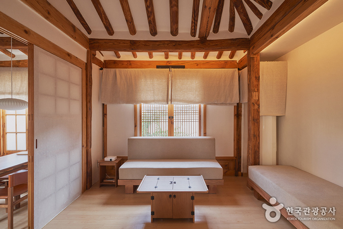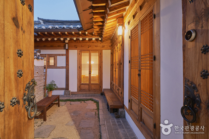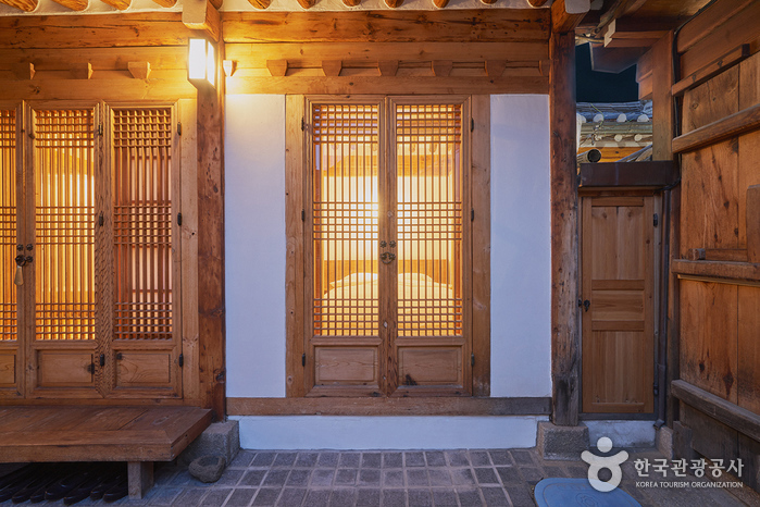 This hanok (traditional Korean house) is located in Seochon Village near Gyeongbokgung Palace. It is a modern C-shaped hanok centered around the inner courtyard, which is the first thing that the guests see after entering through the gate. While it is not expansive, white pebbles and a foot bath make this hanok a unique one. One can enjoy a foot bath while sitting on the porch.
