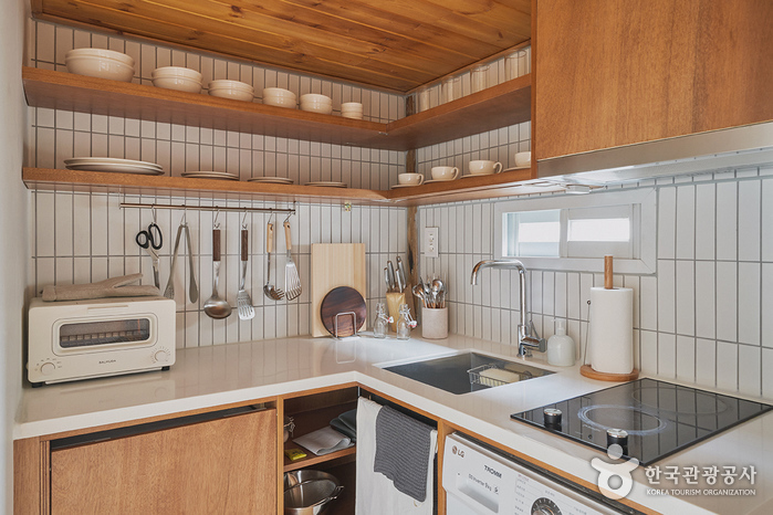 The bedroom, which is located beyond the living room, is furnished with a queen-sized bed. Opening the screen doors brings one to the view of the kitchen area beyond the inner courtyard. A large table, plush sofa, and a small bookcase make the space ideal for books and discussions. Climbing the wooden ladder to the side of the kitchen brings one to the attic, which also doubles as a Korean-style room with a skylight. The kitchen is furnished with a refrigerator, microwave oven, gas stove, electric kettle, toaster, pots, utensils, wine glasses, and bottled water. There is a restroom with a bathtub. The standard occupancy of the house is 4 people.