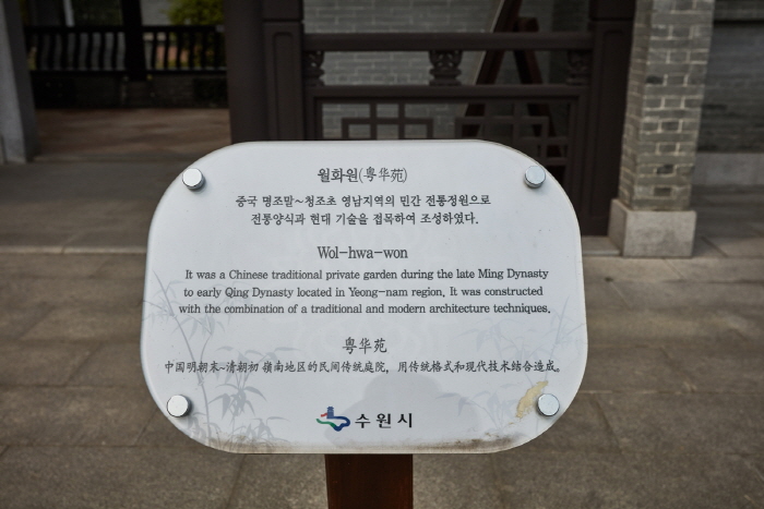 Le jardin Wolhwawon à Suwon est inspiré des jardins traditionnels de la province de Guangdong en Chine. Il a été construit suite au traité conclu en 2003 par les administrations locales de la province coréenne de Gyeonggi-do et celle de Guangdong en Chine sur les échanges entre ces deux régions. Afin de renforcer leurs relations amicales, il a été décidé que chacun province créerait un jardin traditionnel qui représenterait l’autre. En conséquence, la construction de Wolhwawon a commencé en juin 2005 et il a ouvert ses portes au public le 17 avril 2006. Ainsi, le jardin Wolhwawon a été conçu à l’instar du jardin éponyme qui se situe à Guangdong. De son côté, un jardin coréen, Haedong Gyeonggiwon, a été aménagé au sein du parc Yuexiu dans la ville de Guangzhou. Ce jardin ressemble au jardin Soswewon qui se trouve à Danyang, dans la région coréenne de Jeollanam-do.