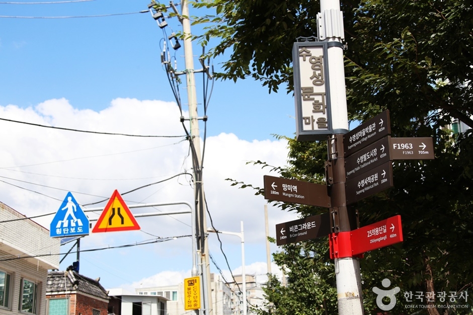À côté de Mangmidan-gil se trouve B-Con Ground, un complexe culturel local aménagé sous la voie surélevée de Suyeong, où l’on peut profiter de divers équipements et installations. À proximité se trouve également le parc Suyeong Sajik, qui en fait un lieu idéal pour découvrir des sites historiques tout en profitant d’un espace de détente.
