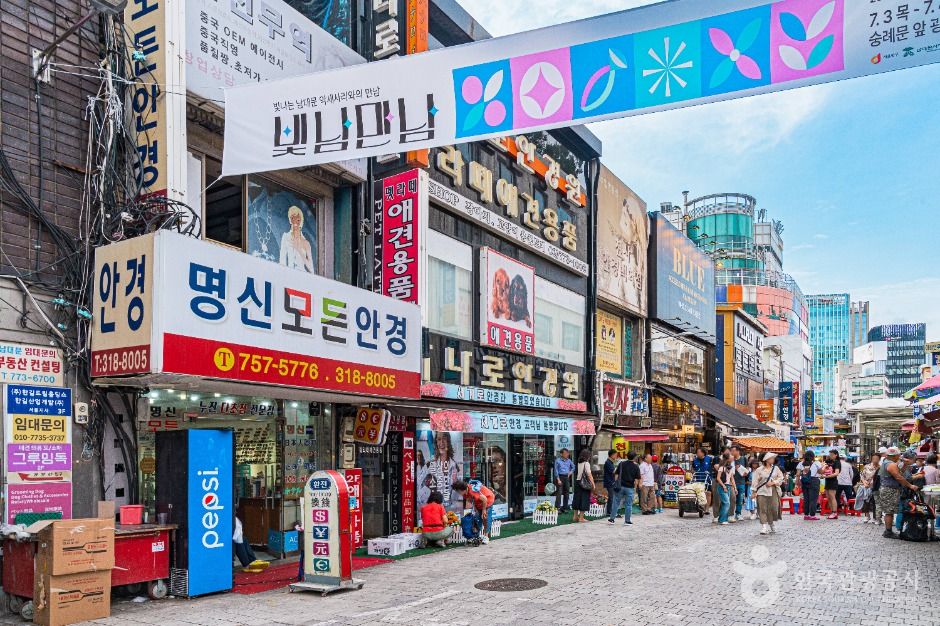 Le marché de Namdaemun regroupe plus de 150 magasins de gros et de détail spécialisés dans les lunettes, ce qui représente plus de 50 % de la distribution nationale dans ce secteur. Les boutiques se concentrent principalement à Namchang-dong, derrière le centre d’importation de Sungnyemun, ainsi que dans le bâtiment principal du marché, le centre commercial de Namdaemun, au 2ᵉ étage du théâtre de Namdaemun, le long de la rue piétonne de Namdaemun-ro et à l’entrée du marché sur Toegye-ro, notamment dans le complexe “Segyero Optical Town”. Certaines enseignes sont également dispersées dans d’autres zones. Parmi ces magasins, certains de grande taille produisent et vendent leur propre marque, tandis que d’autres travaillent en lien direct avec des usines sous-traitantes. Dans les deux cas, les consommateurs peuvent acheter des lunettes 30 à 50 % moins cher que les prix pratiqués sur le marché classique.