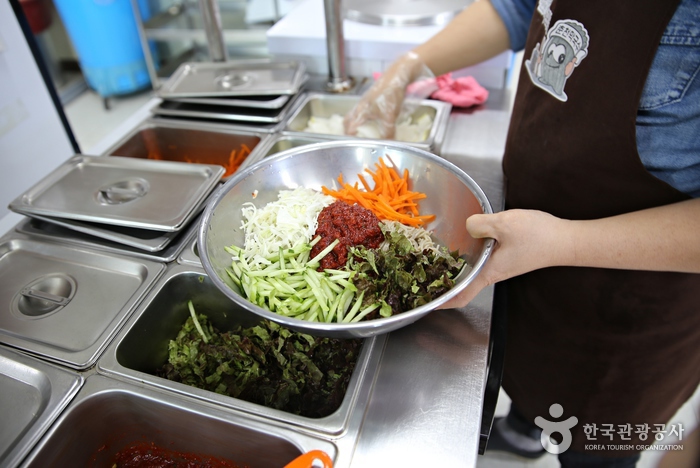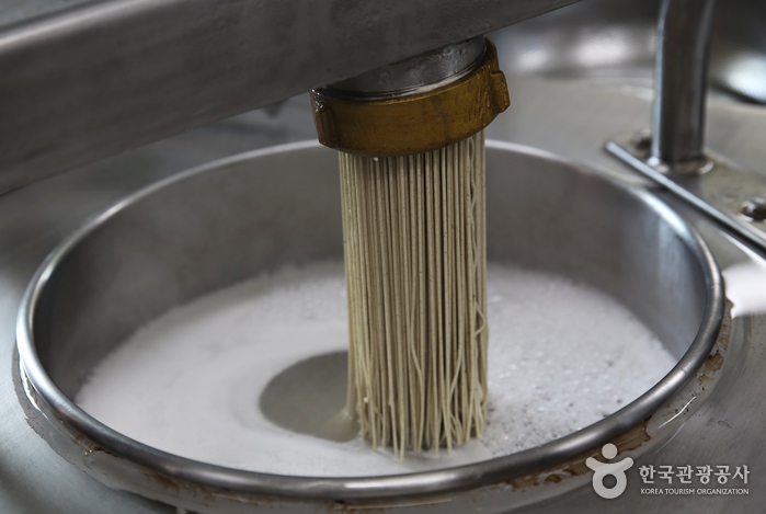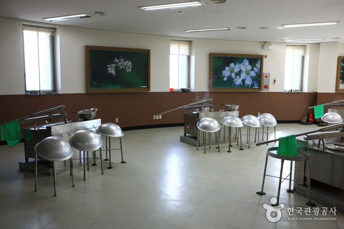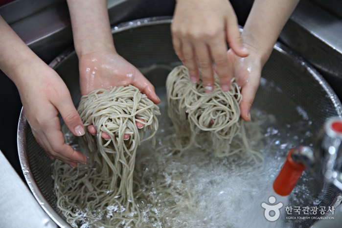 Le hall « expérience du makguksu » propose des ateliers pratiques : les participants peuvent apprendre à faire des nouilles Makguksu de A à Z et le goûter ensuite. Le programme dure environ 40-50 minutes.