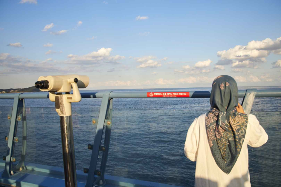 Inaugurée le 27 juillet 2024, la plateforme d’observation Haewol se trouve sous Dalmaji-gil. Son nom, qui évoque la rencontre du soleil et de la lune dans un même paysage, reflète parfaitement son environnement naturel. Située à 22 mètres au-dessus du niveau de la mer et s’étendant sur 134 mètres en direction de l’océan sous la forme d’une structure circulaire, elle comprend un pylône principal en forme de croissant de lune et une place circulaire de 15 mètres de diamètre dotée d’un plancher transparent, permettant d’admirer la mer en contrebas.