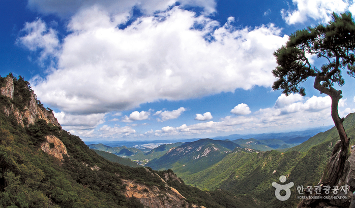 *Cette montagne comporte 15 sommets, dont le somment principal Cheonhwangbong (845,1m) puis Sambulbong, Sinseongbong, Gwaneumbong, ec. La montagne est célèbre pour ses nombreux endroits à visiter avec ses structures de roche très diverses sur le versant ouest, les chutes d’eau Yongmun, mais aussi à l’est avec les chutes d’eau Eunseon puis au sud avec les chutes d’eau Amyongchu et Sosyongchu.