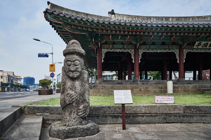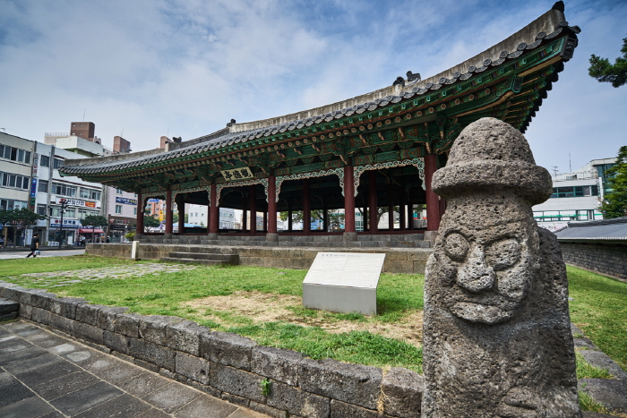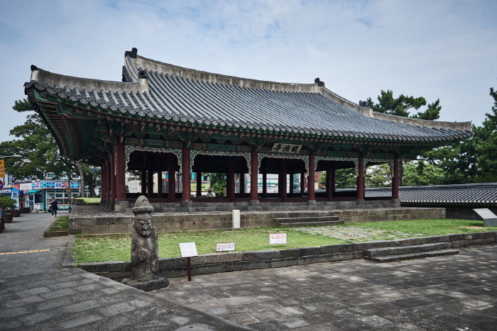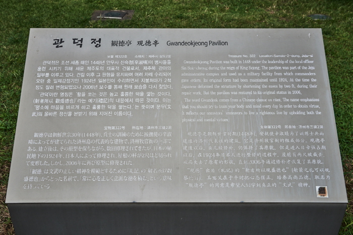 Une des plus anciennes architectures sur l’île de Jéju, le pavillon Gwandeokjeong a été construit par le pasteur Sin Suk-Cheong dans la trentième année du règne du Roi Sejong (1448) comme un terrain d’entrainement. Pour sa contribution historique pour le renforcement de l’esprit et les âmes des soldats (« Gwandeok » signifie littéralement un exercice de l’esprit et la vertu), Gwangdeokjeong a été désigné Trésor national n°322 en 1963.