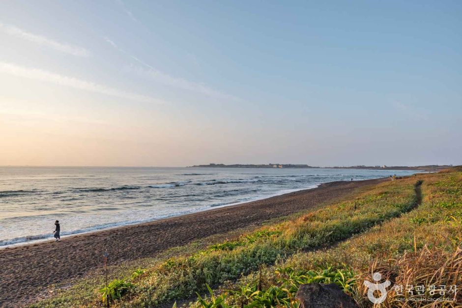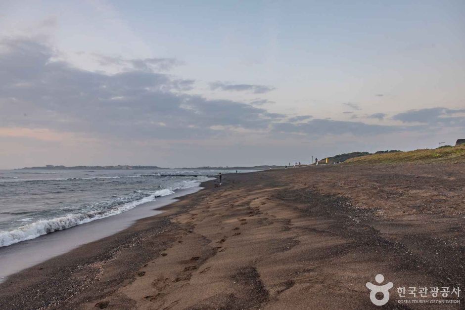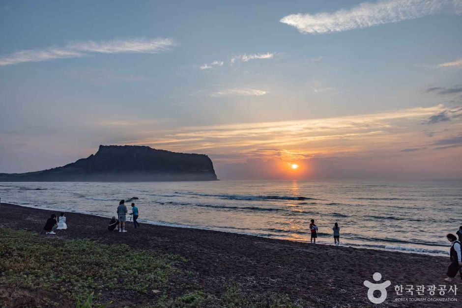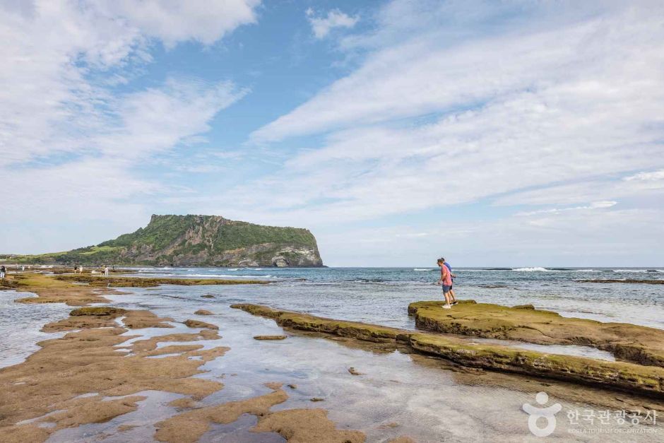 La plage de Gwangchigi, située sur le chemin de Seongsan Ilchulbong vers Seopji Koji, est le point final du Jeju Olle parcours 1 et le point de départ du Jeju Olle parcours 2. Sa structure géologique est caractérisée par des laves bouillonnantes qui ont rapidement durci au contact de la mer. En particulier, à marée basse, des paysages spectaculaires, cachés sous l’eau, se révèlent et offrent des trésors naturels. Ce spectacle des roches volcaniques et des mousses vertes crée un paysage unique que l’on ne peut trouver nulle part ailleurs dans le monde, attirant de nombreux photographes. En outre, la plage permet de capturer l’aube se levant à côté de Seongsan Ilchulbong dans un seul cadre, attirant de nombreuses personnes pendant la période des fêtes de début et de fin d’année. Le sable de la plage de Gwangchigi est composé de grains produits par l’érosion du basalte au fil du temps, ce qui lui confère une couleur noire caractéristique. (Source : Visit Jeju)