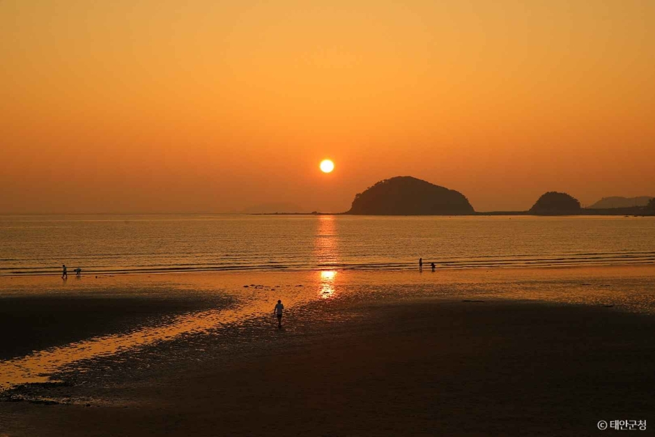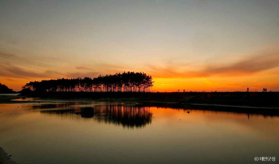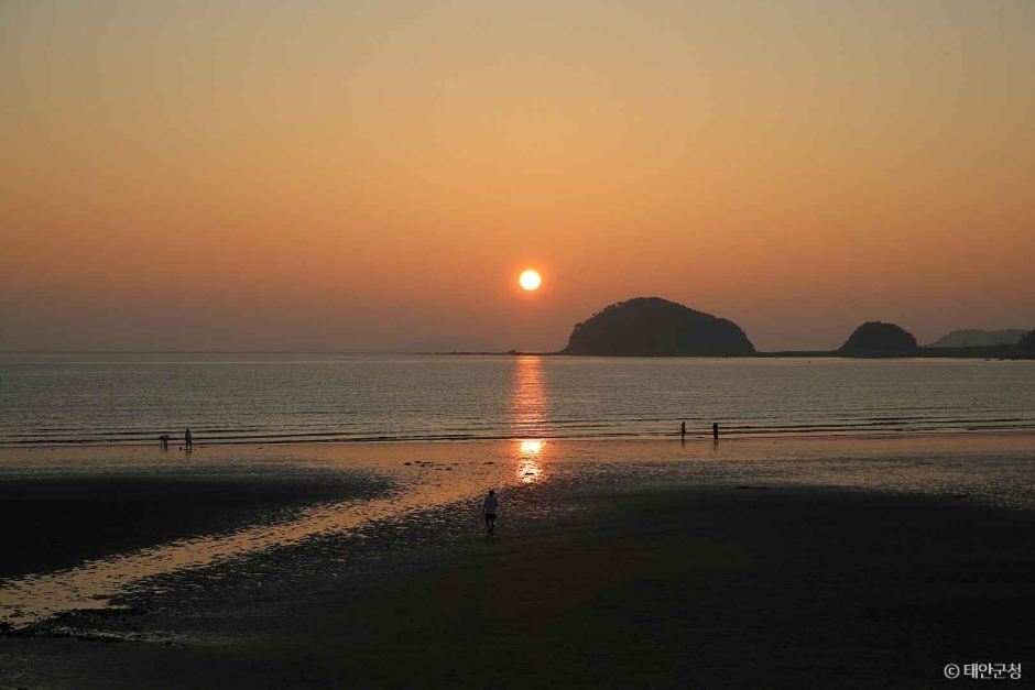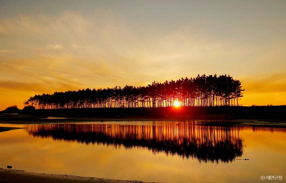 Le nom « Unyeo » (運礖) vient de l’image de la mer ouverte et agitée dont les vagues, en se brisant contre les rochers, forment une écume majestueuse semblable à des nuages. « Yeo » désigne un rocher qui émerge à marée basse et disparaît sous l’eau à marée haute. Située entre les plages de Saetbyeol et Jangsampo, à l’ouest d’Anmyeondo, la plage d’Unyeo est réputée pour son paysage naturel préservé, avec ses dunes côtières et ses pièges à poissons traditionnels en pierre. De plus en plus prisée comme lieu de tournage, elle attire également les amateurs de camping. La plage est particulièrement célèbre pour ses magnifiques couchers de soleil. Au sud de la plage se trouve une digue bordée de pins. Une extrémité de cette digue a été rompue par les vagues, et à marée haute, l’eau de mer y forme une sorte de lac intérieur, donnant à cette digue boisée l’aspect d’une île flottante.