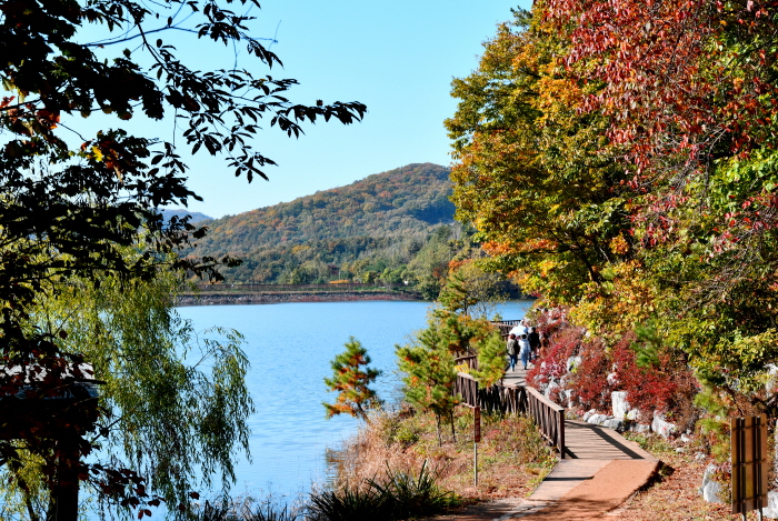 Entouré de montagnes et d’arbres, le lac Majang offre un panorama magnifique où les reflets de l’eau, le coucher du soleil et les forêts environnantes se mêlent harmonieusement. C’est l’un des sites naturels emblématiques de Paju, idéal pour s’évader du quotidien et se ressourcer au cœur de la nature. Aménagé en parc écologique, le lac Majang est un lieu parfait pour une sortie en famille ou en couple. On y trouve une promenade en bois de 3,6 km longeant les rives ainsi qu’un pont suspendu de 220 m de long, qui ondule doucement au passage des visiteurs, suscitant leur émerveillement. Pour plus de confort, un café situé dans le pavillon d’observation et le bâtiment administratif permet de savourer une boisson chaude en admirant la vue sur le lac. Le camping, niché entre la forêt et le plan d’eau, offre un espace de repos agréable où l’on peut contempler le coucher du soleil ou la brume matinale. Le site propose également des activités nautiques comme le canoë et le kayak.