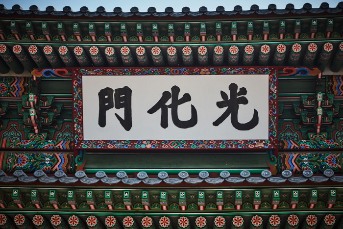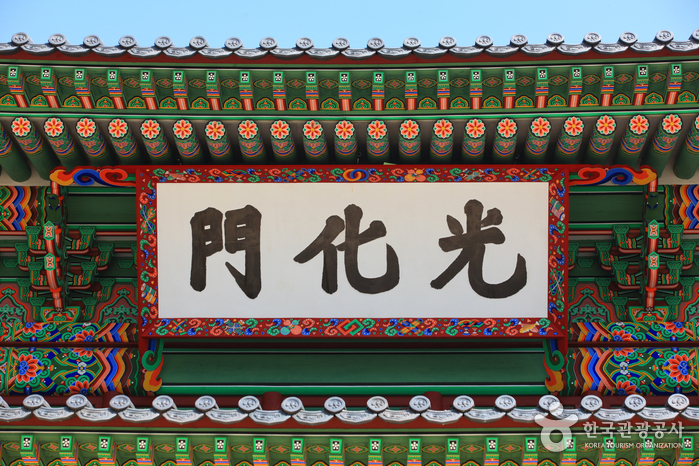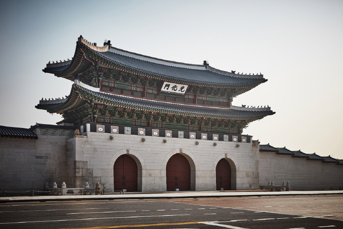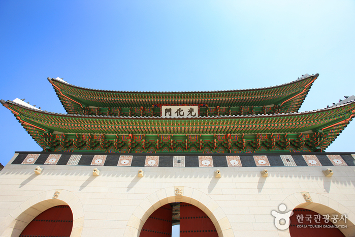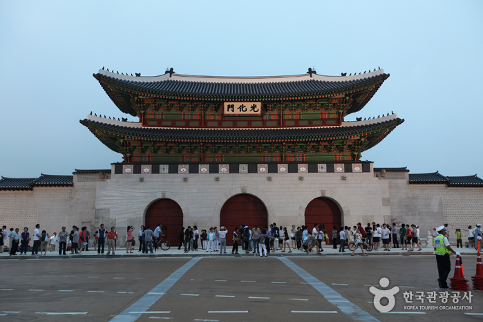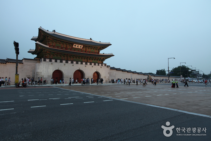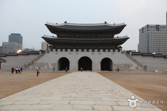 La Porte Gwanghwamun a été construite de granite. Au centre, il y a une entrée ressemblant à un arc-en-ciel, appelée Hongyemun, et au-dessus, se trouve la tour de la porte. La Porte Gwanghwamun renferme un souvenir douloureux dans l’histoire de la Corée. Durant l’ occupation japonaise de la Corée, de façon à tuer les esprits des citoyens coréens, le général du gouvernement japonais avait détruit la porte et construit son propre bâtiment gouvernemental. L’apparence réelle de la porte est celle de 1968 lorsqu’elle a été reconstruite en utilisant du béton, et elle est située environ à 10m derrière le point d’origine. Pour restituer la forme d’origine de la porte, le gouvernement a entrepris des travaux d’aménagement à partir de 2006, ces travaux se sont terminés le 15 août en 2010.