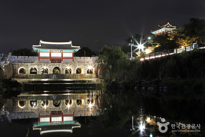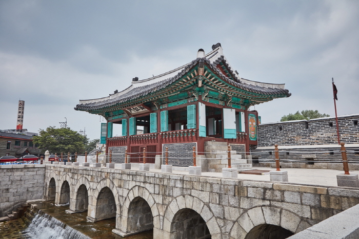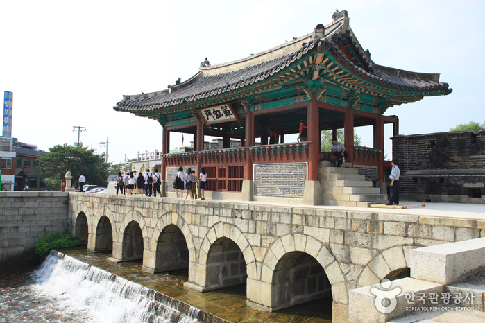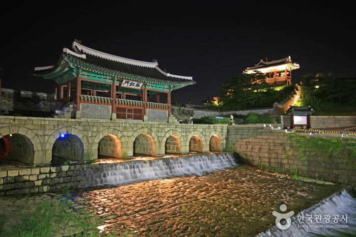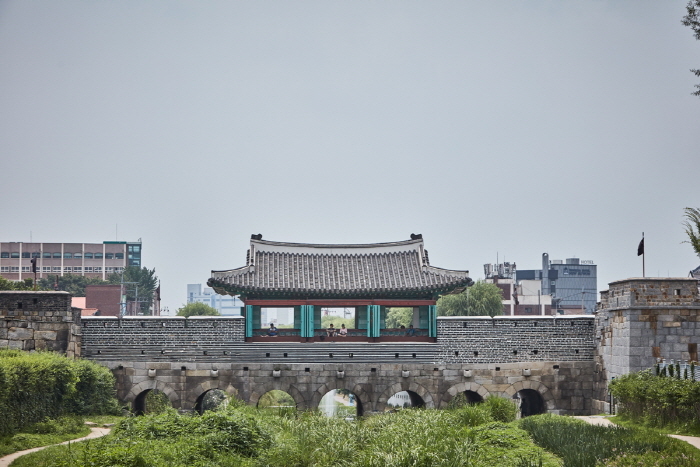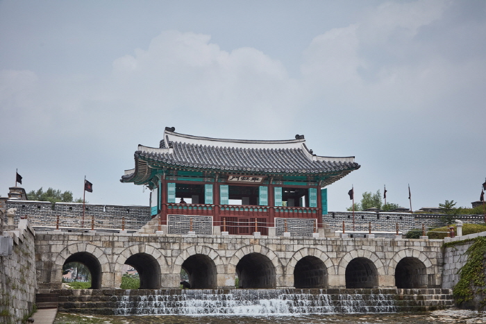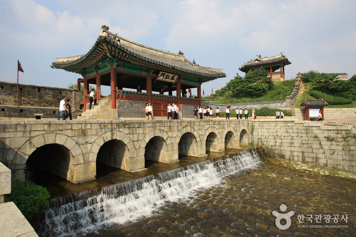La rivière de Suwon coupe à travers la Forteresse Hwaseong du Nord au Sud. Des vannes furent installées aux murs nord et sud afin de permettre à la rivière de passer. La Porte Hwahongmun est la porte nord de la forteresse et contient sept arches de tailles différentes pour mieux permettre à l’eau de s’écouler. L’ouverture centrale est plus large que celles vers l’exterieur, la rendant plus apte à controler les précipitations. Sur la colline à l’est de la porte se tient le fabuleux banghwasuryujeong.