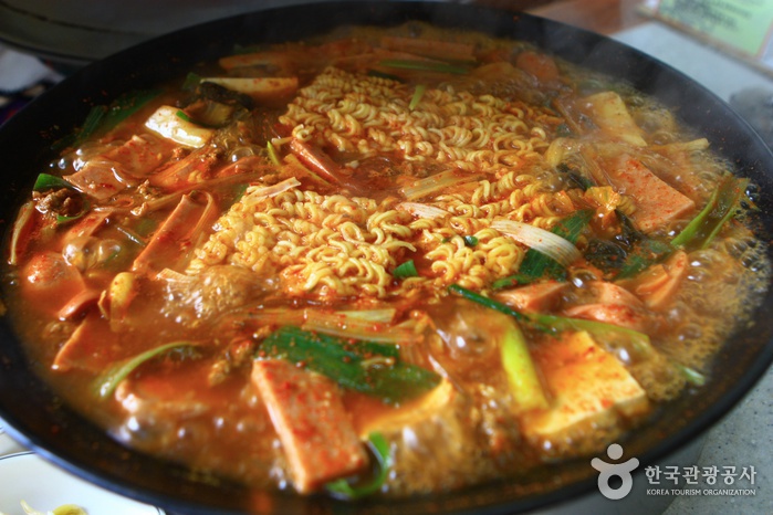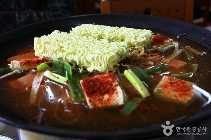 La rue majeure de Uijeongbu Budaejjigae (의정부 명물찌개거리) est le lieu où les restaurants locaux ont commencé à être construits en 1998. Vous pourrez y goûter le budae jjigae (부대찌개, “ragout de l’armée”, une épaisse soupe coréenne) qui est réalisée en faisant bouillir des ingrédients occidentaux comme du jambon, des saucisses, haricots américains mixés avec du kimchi (plat traditionnel coréen à base de légumes marinés avec des assaisonnements variés) et de la pâte de piment. Le budae jjigae est l’un des