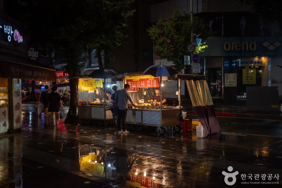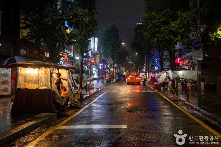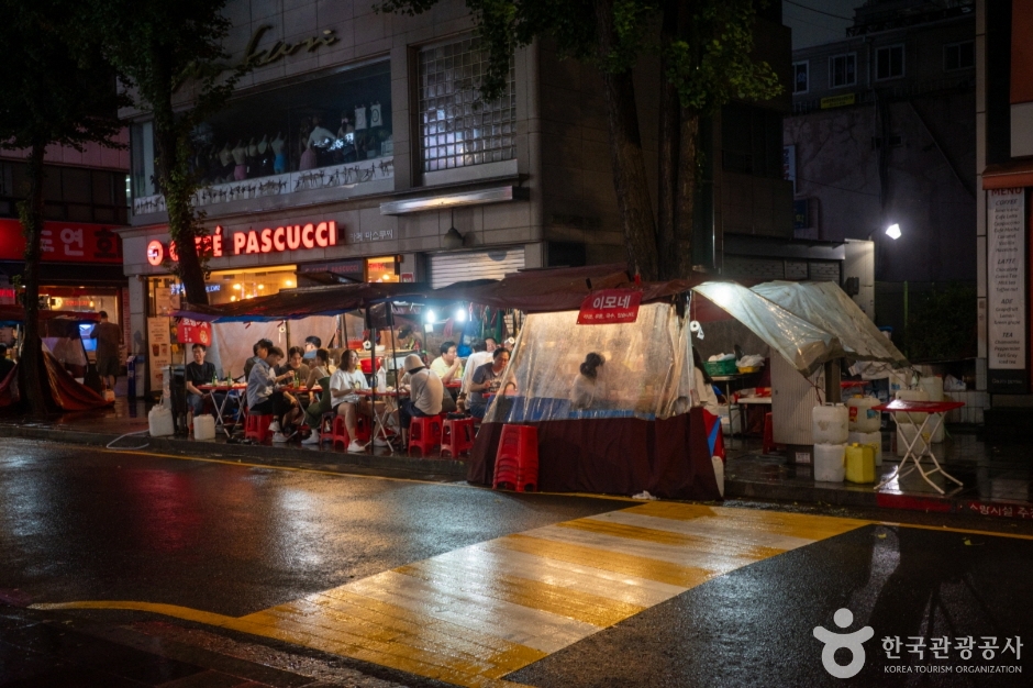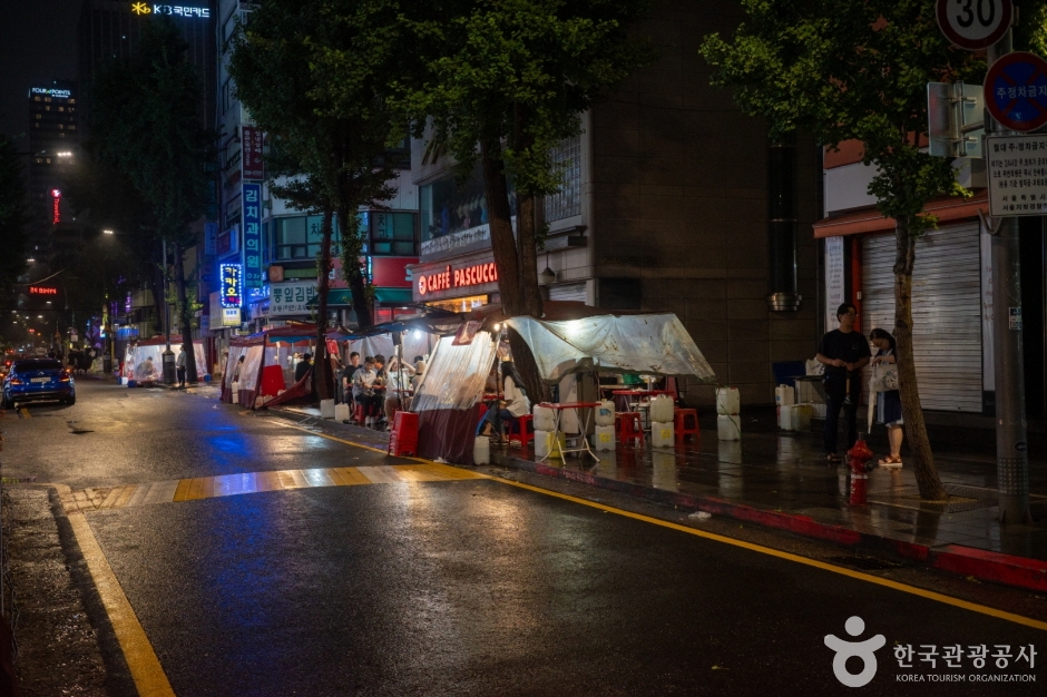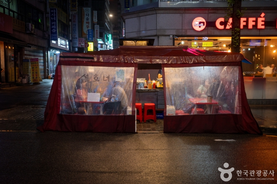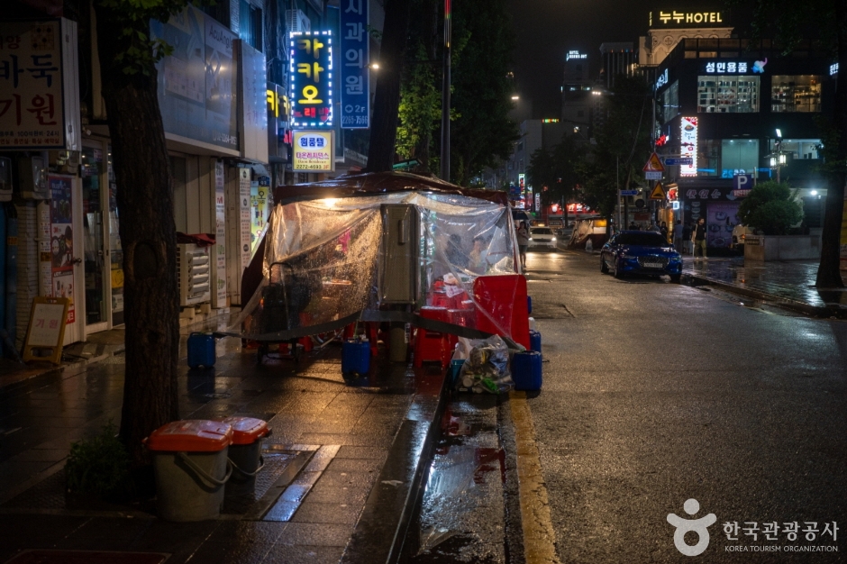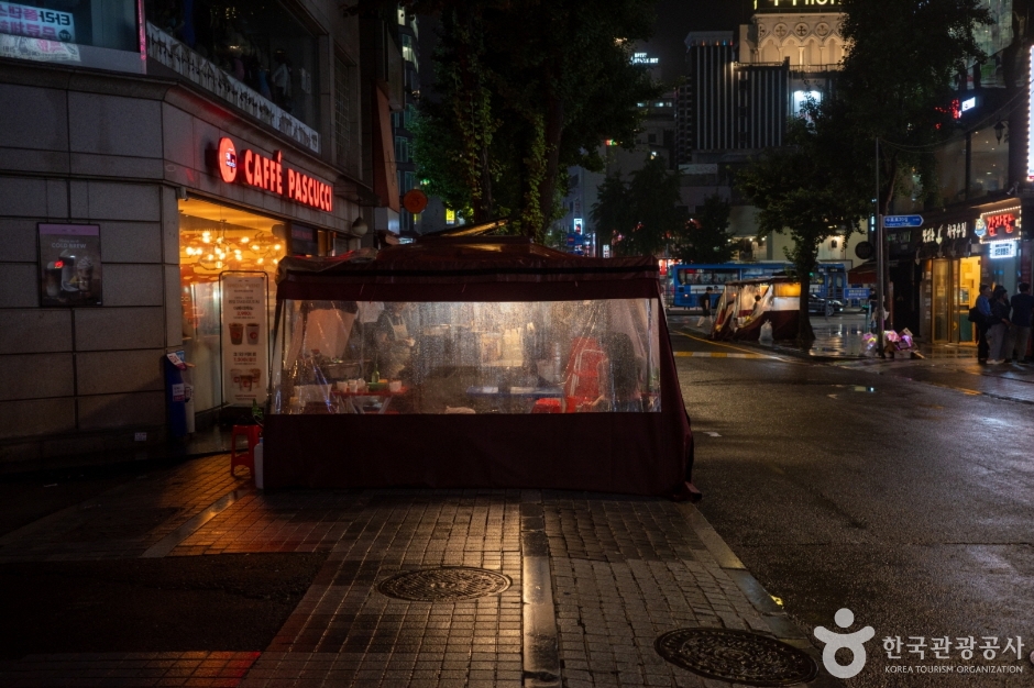 La Rue des pojangmachas de Jongno 3-ga est une rue formée du côté de la sortie 1 de la station de métro Jongno 3-ga sur la ligne 1 et la ligne 5. C’est aussi appelé « rue de nuit de Jongno 3-ga », et pratiquement chaque sortie de la station Jongno 3-ga a une rue de stands de nourriture. En particulier, à la sortie 13, des propriétaires ayant plus de 20 ans d’expérience dans les stands de nourriture gèrent leurs affaires, ce qui en fait un endroit réputé pour la gastronomie. Grâce à l’atmosphère animée et au charme des soirées, les clients ne manquent jamais. Bien qu’il y ait des établissements ouverts dès l’après-midi, la plupart fonctionnent généralement de l’heure du dîner jusqu’à l’aube. De nombreuses entreprises sont situées près de Gwanghwamun, Jonggak et de la mairie, et il y a beaucoup de sites touristiques dans les environs comme Ikseon-dong et Insadong, attirant de nombreux employés de bureau et touristes étrangers. Chaque stand de nourriture a un menu différent, permettant de déguster des fruits de mer comme le nakji vivant, le myeongge, et le sea cucumber, ainsi que des plats de rue comme les udon et les ramen, le tout en un seul endroit.