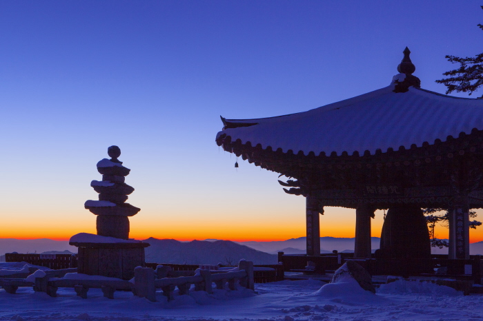 L’époque exacte de la fondation Sangwonsa n’est pas connue, mais à en juger par la pagode en pierre et d’autres reliques du temple, sa construction est estimée à la dynastie Shilla. Les deux pagodes en pierre devant le sanctuaire ajoutent la grandeur au temple en haute montagne et sont désignées comme patrimoines culturels du Gangwon-do.