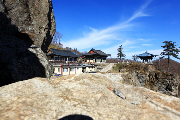 Le temple Sangwonsa est construit sur un sol en pierre d’une taille d’environ 100 pyeong (soit environ 330 m²) et est situé au bord de Namdaebong (1 182 m) à l’extrémité sud de la montagne Chiaksan. De l’eau de source fraîche jaillit d’une fissure de la roche à côté du temple et devant le temple. Il y a également une falaise de 40 m de hauteur et au pic de celle-ci se trouvent trois canneliers rares. L’histoire du faisan qui a rendu service, qui est à l’origine du nom de la montagne Chiaksan, est une légende qui prend racine dans ce temple.