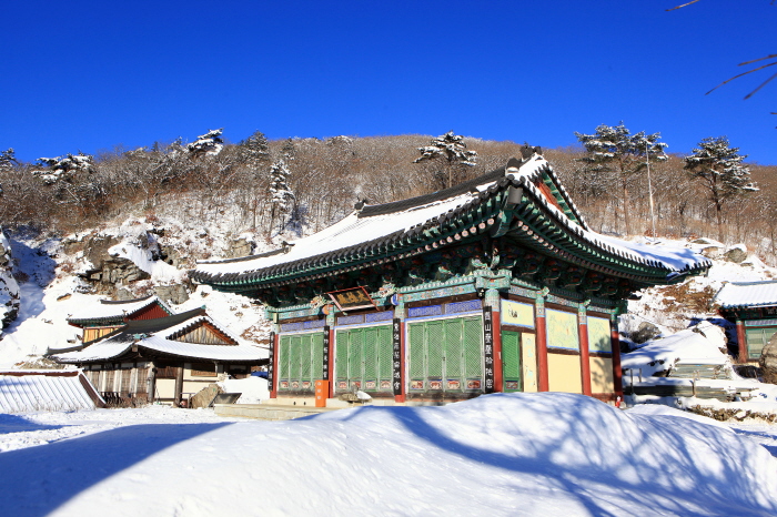 Le temple Sangwonsa est construit sur un sol en pierre d’une taille d’environ 100 pyeong (soit environ 330 m²) et est situé au bord de Namdaebong (1 182 m) à l’extrémité sud de la montagne Chiaksan. De l’eau de source fraîche jaillit d’une fissure de la roche à côté du temple et devant le temple. Il y a également une falaise de 40 m de hauteur et au pic de celle-ci se trouvent trois canneliers rares. L’histoire du faisan qui a rendu service, qui est à l’origine du nom de la montagne Chiaksan, est une légende qui prend racine dans ce temple.